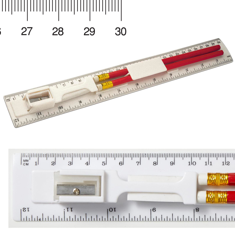 5–Delige kunststof liniaalset (30 cm), bestaande uit 2 houten potloden, puntenslijper en gum.