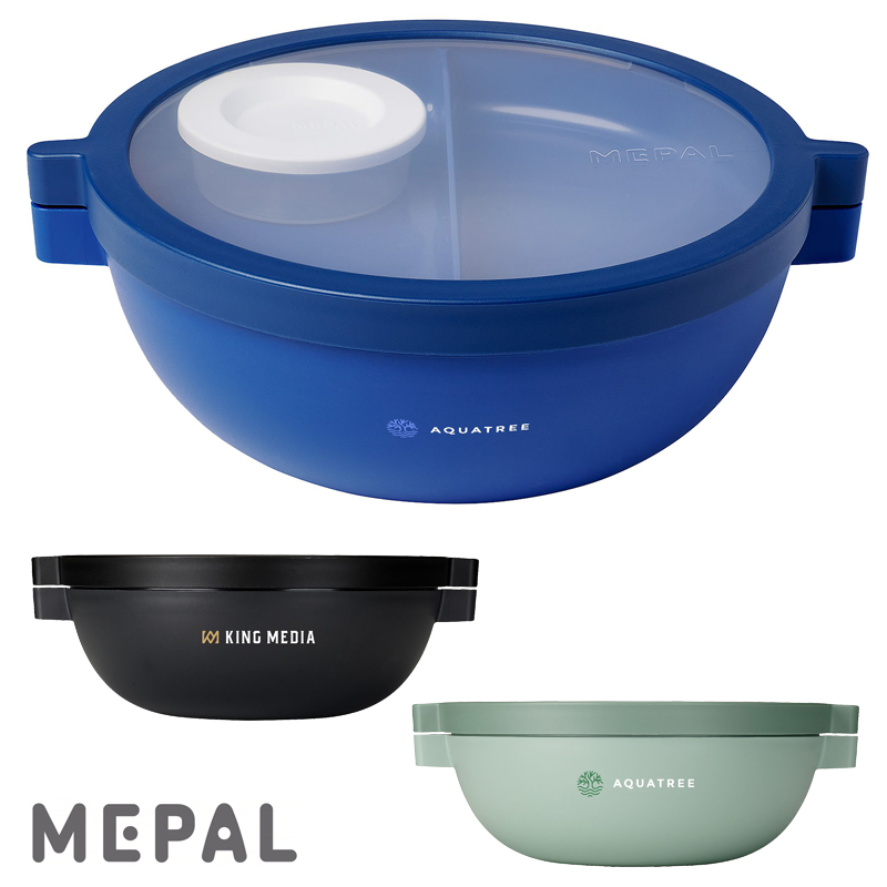 Met drie uitneembare bakjes: een tray met verdeler, een klein afsluitbaar bakje voor dressing of topping en een groter bakje met deksel.