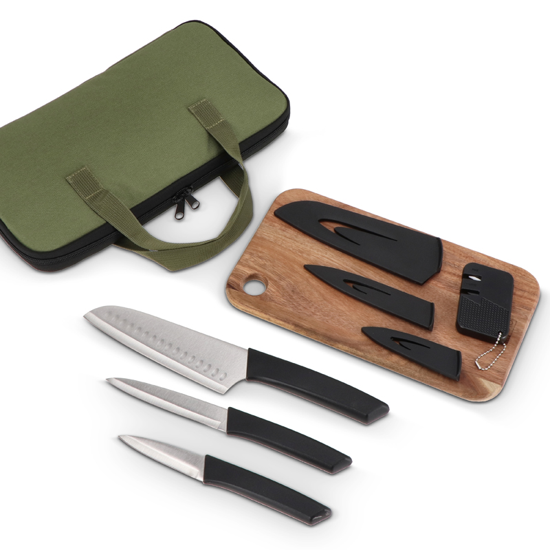 De set bevat een Santoku-, snij- en schilmes, elk met beschermhoes, plus een acaciahouten snijplank en een messenslijper.