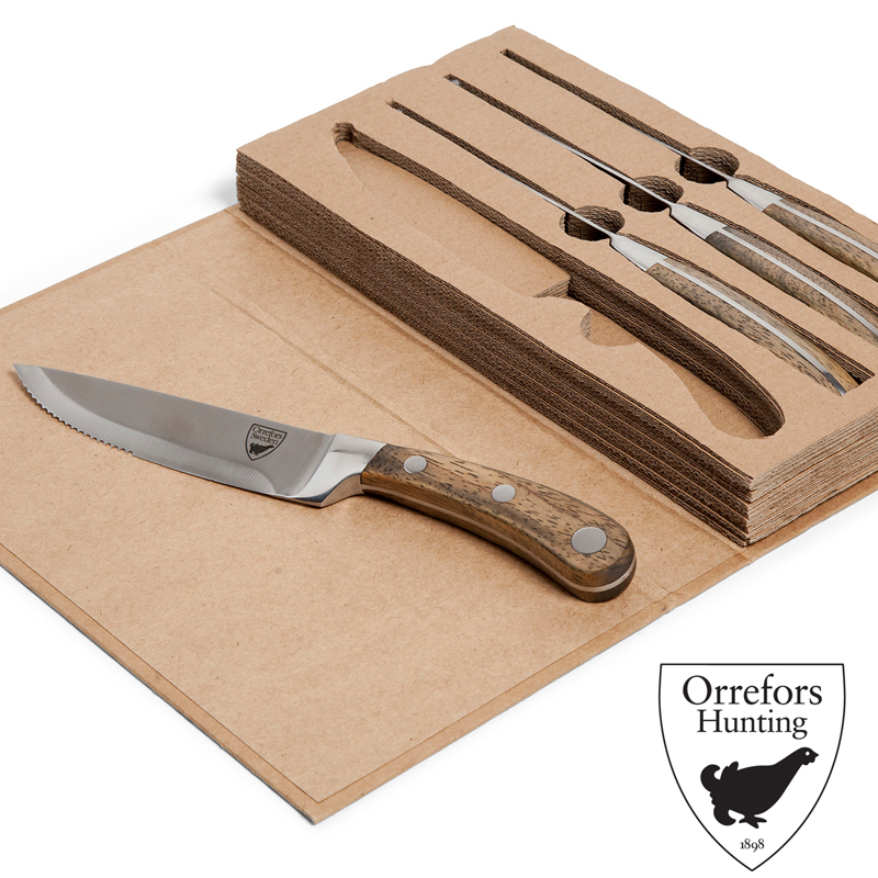 Vier degelijke barbecuemessen van Orrefors Hunting hebben een houten handvat.