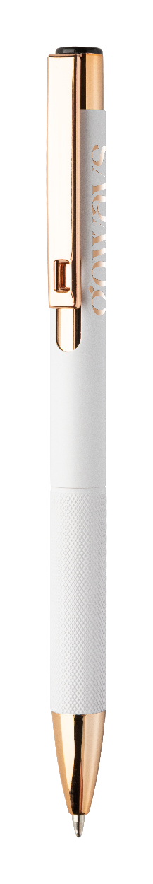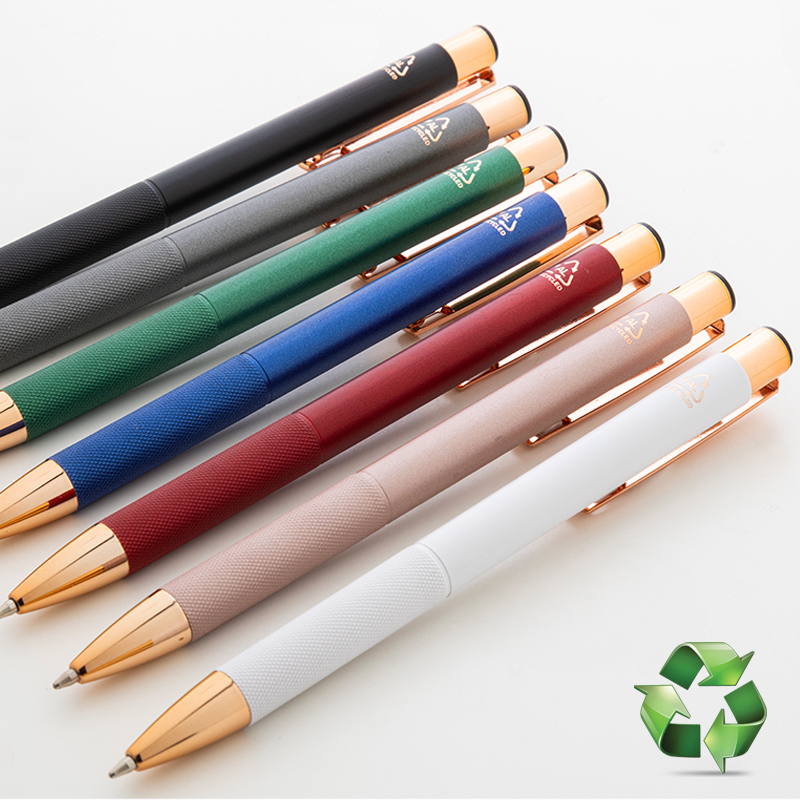 Gerecyclede aluminium balpen met matte afwerking, getextureerde grip en roségouden details.