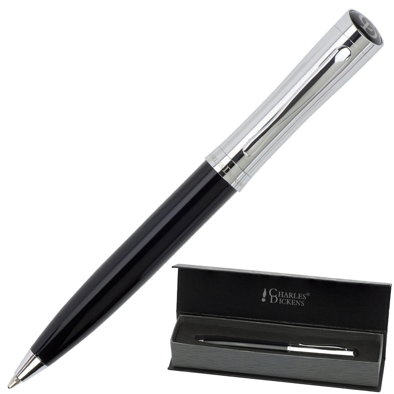 Metalen Charles Dickens™ balpen met draaimechanisme, zwartschrijvend, met Charles Dickens doming op de top, in een zwarte kartonnen geschenkverpakking.