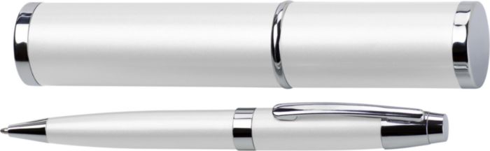 Metalen balpen, zwartschrijvend, met zilverkleurige accessoires, verpakt in een luxe koker.
