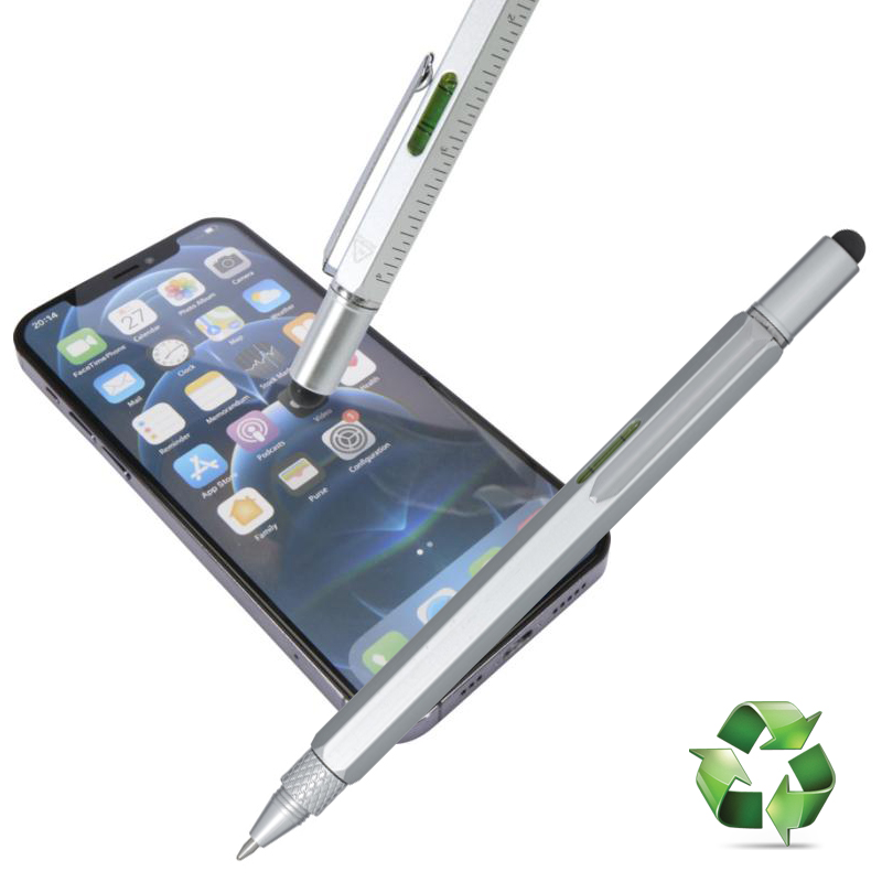 De Dora aluminium multifunctionele balpen is gedeeltelijk gemaakt van gerecycled materiaal en heeft een dubbelzijdige liniaal, hendel, schroevendraaier, gradenboog en een zwarte rubberen stylus.