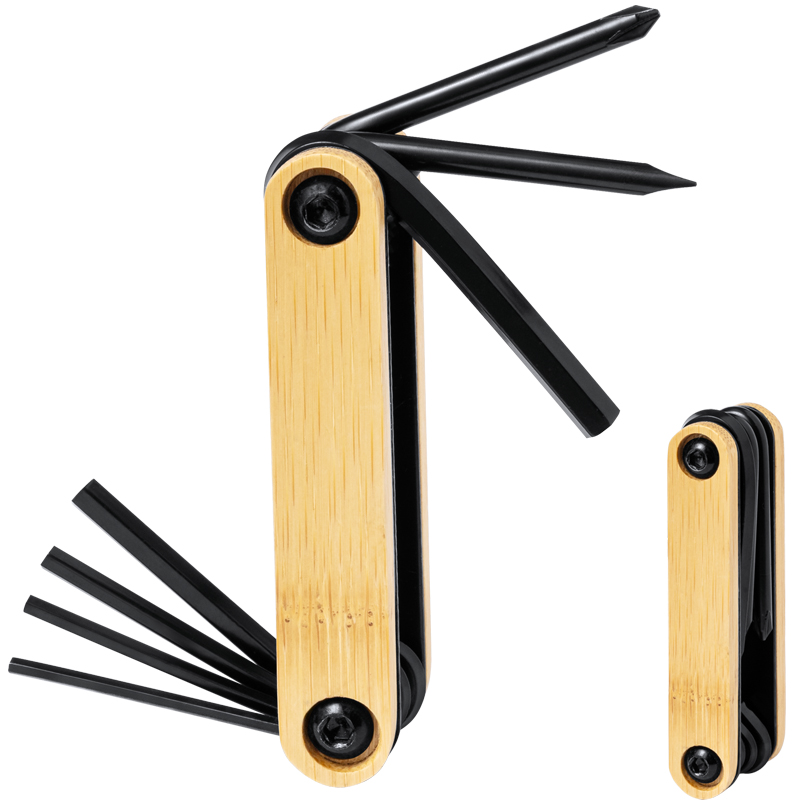 Multitool van zwart koolstofstaal met bamboehandvat en 7 functies (5 inbussleutels, platte en kruiskopschroevendraaiers).