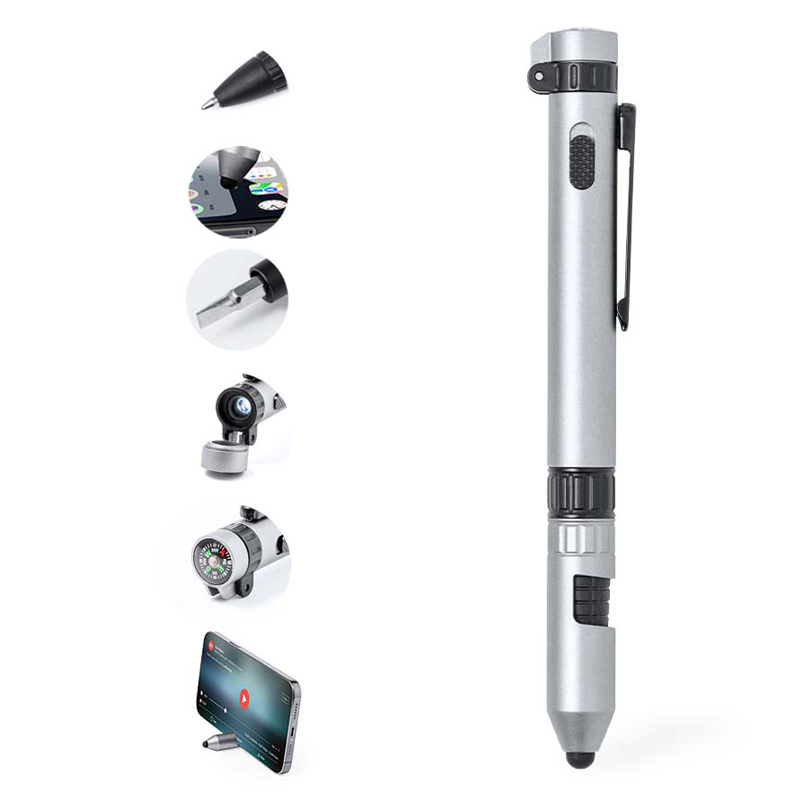 Bevat: houder voor mobiele telefoon, stylus, blauwschrijvende pen, zaklamp gevoed door knoopcelbatterij (inbegrepen), kompas, platte en kruiskopschroevendraaier.