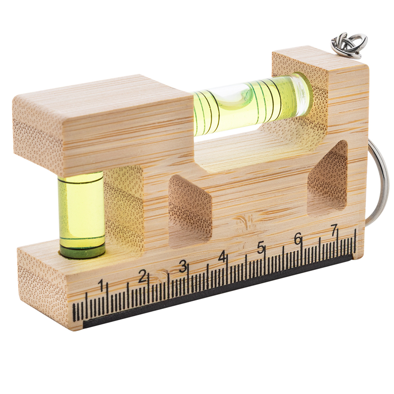 Multifunctionele, bamboe sleutelhanger met metalen ring, liniaal, magneet en dubbele waterpas.
