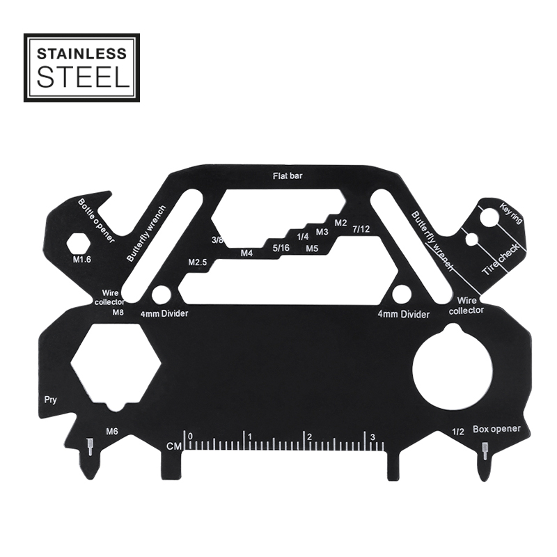 Met 30 functies, waaronder: platte en Philips-schroevendraaier, sleutel voor zeshoekige moeren in verschillende maten, meetlat en flesopener.