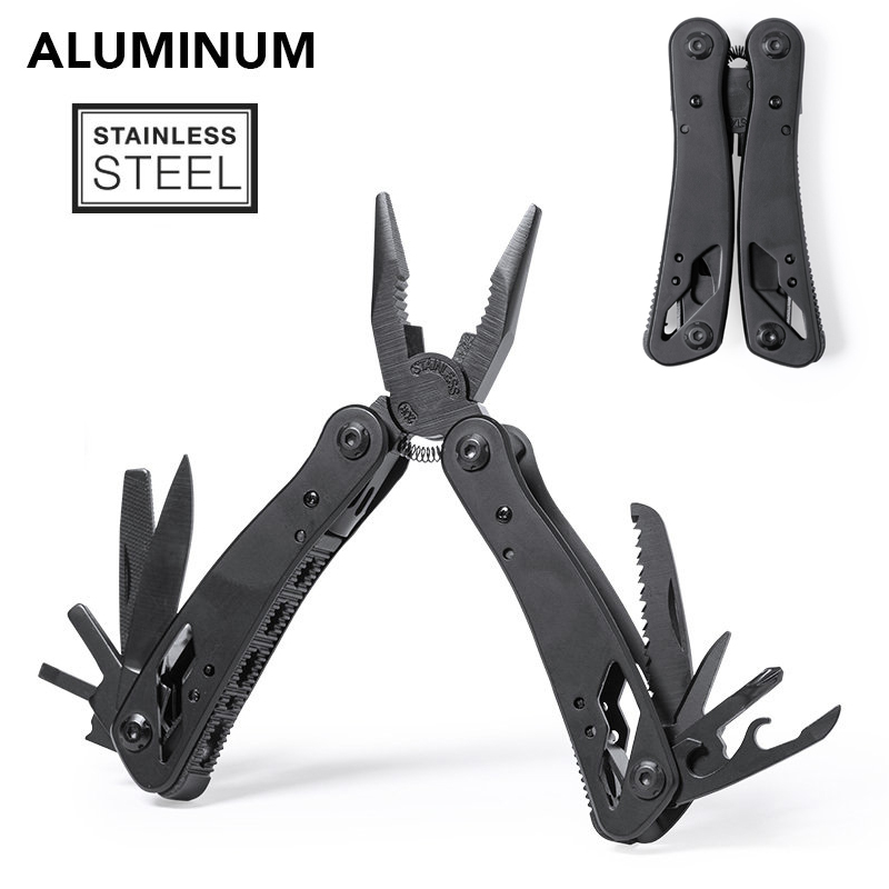 Met 12 functies, waaronder mes, schroevendraaier, vijl, opener en tang.