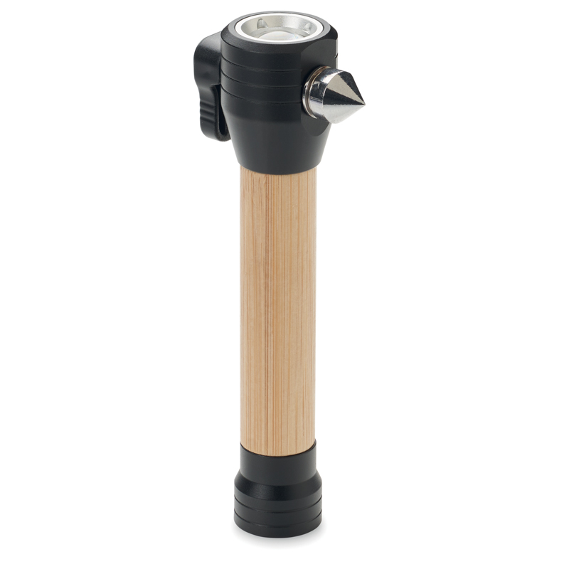 3 in 1 bamboe zaklamp met veiligheidshamer en gordelsnijder.