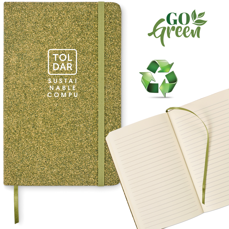A5 notitieboek met harde kaft gemaakt van 20% theedrab, 30% kurk en 50% polykatoen.