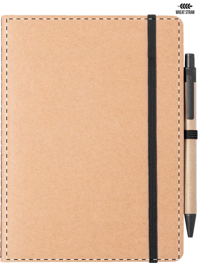 Notitieboek van gerecycled karton met 60 blanco vellen en gekleurde rubberen band, A5–formaat.