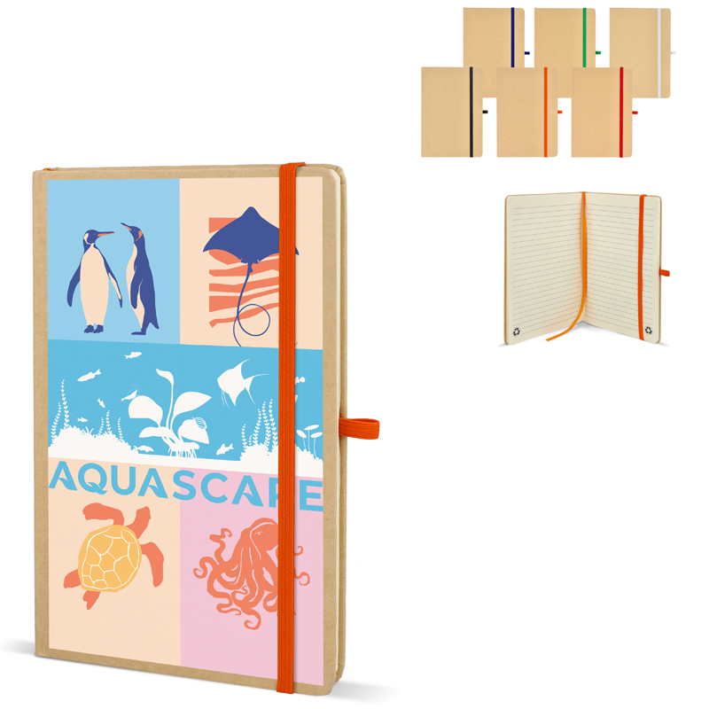 A5-notitieboek met kartonnen omslag, afgeronde hoeken, gekleurde elastische sluiting, leeslint en pennenlus.