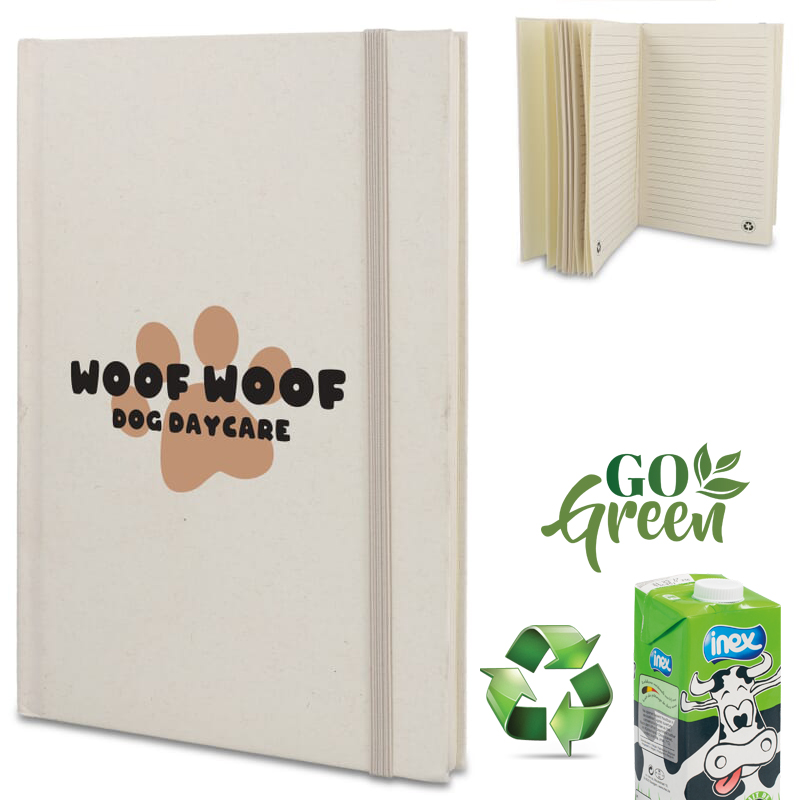 Het bevat 80 vellen 70g/m2 gelinieerd gerecycled melkpakpapier, met een sluiting van elastiek en een placemarker met lint.