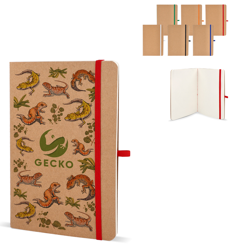 A5-notitieboek met een zachte kaft van kraftpapier, afgeronde hoeken, gekleurde elastische sluiting en pennenlus.