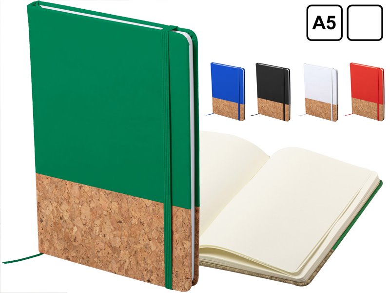 Notitieboek van natuurkurk en PU lederen cover met rubberen strap.