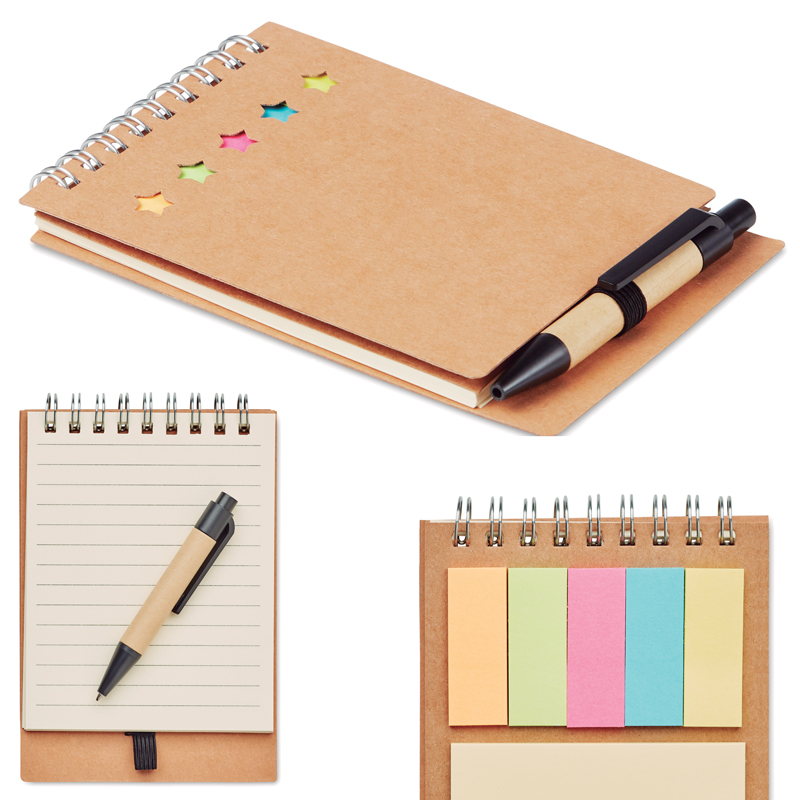 Gerecycled notitieboekje met 5 gekleurde pagina labels en een memoblokje van 20 vellen.