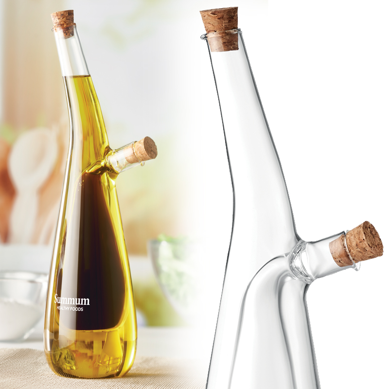 Een fles voor olie en azijn gemaakt van borosilicaatglas met stop van kurk.