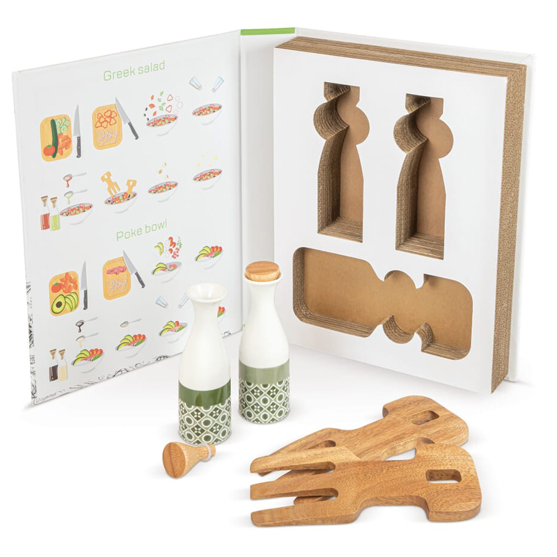 Deze verpakking in boekstijl design bevat een keramische set voor olie & azijn en een set slaklauwen.
