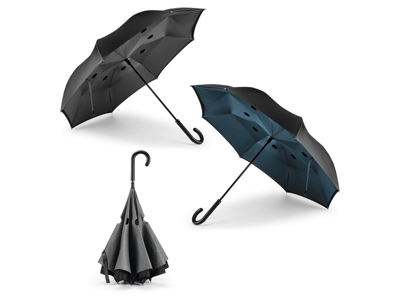Omkeerbare paraplu van pongee polyester (190T) met dubbele afdekking, metalen handvat en glasvezelstang.