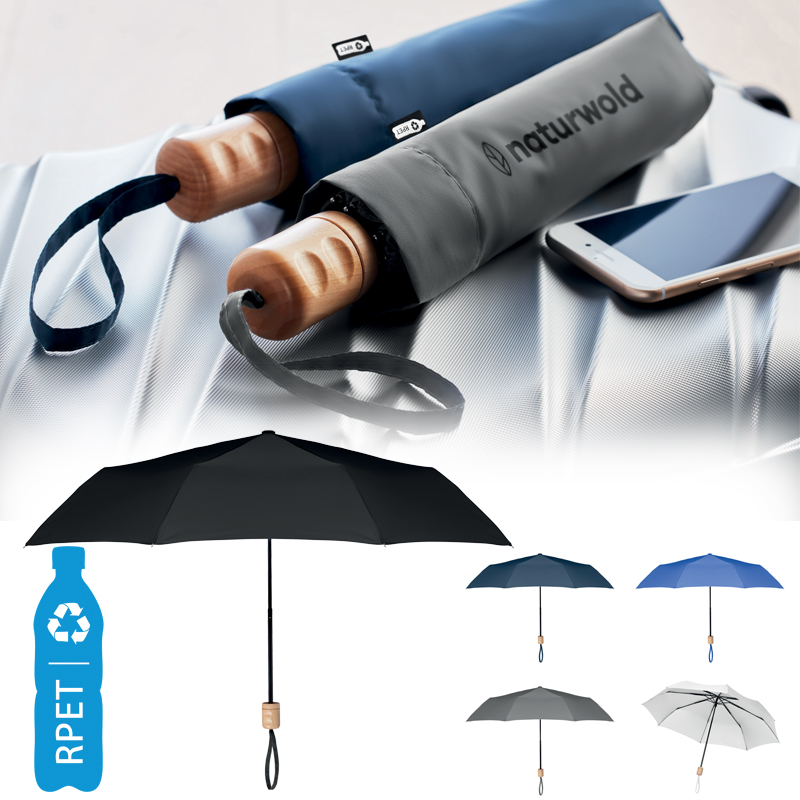 21 inch paraplu van 190T RPET pongee met zwart metalen frame en baleinen.