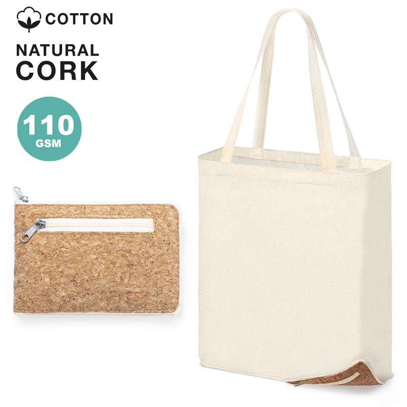 Vouwtas van natuurlijn in combinatie van 100% katoenen materialen van 110 g/m² en natuurlijke kurkbodem, met zak.