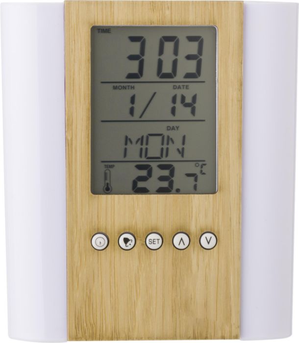 Bamboe en plastic pennenhouder met multifunctionele klok.