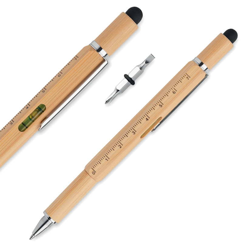 Waterpaspen van bamboe met draaimechanisme, 7 cm liniaal, stylus en kruiskop– en platte schroevendraaierbits.