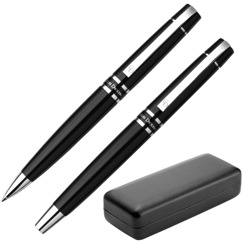 2–Delige Charles Dickens™ schrijfset bestaande uit een metalen balpen met draaimechanisme en rollerbal, zwartschrijvend, in een luxe cassette.