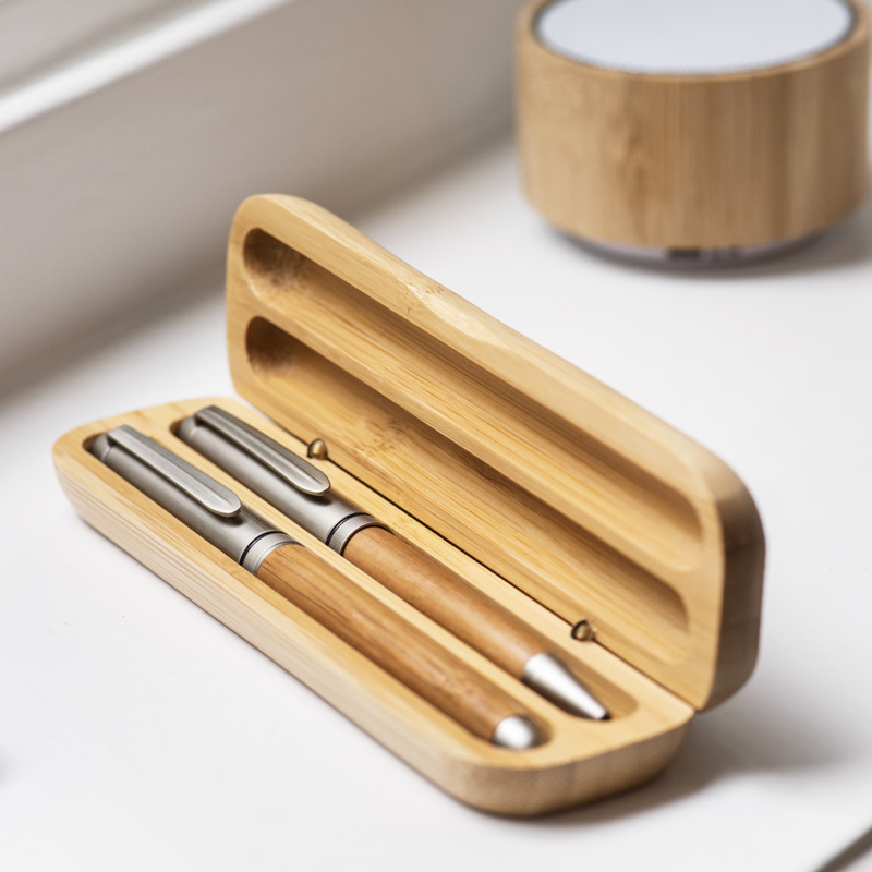 2–Delige schrijfset bestaande uit een bamboe/metalen balpen en rollerbal, blauwschrijvend, met metalen tip en clip, in een bijpassende cassette.