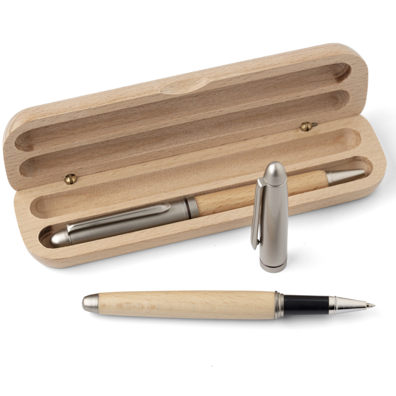 2–Delige schrijfset bestaande uit een beukenhouten/metalen balpen en rollerbal, blauwschrijvend, met metalen tip en clip, in een bijpassende cassette.