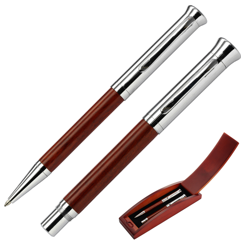 2–Delige schrijfset bestaande uit een rozenhout/metalen balpen en rollerbal, zwartschrijvend, verpakt in luxe houten cassette.