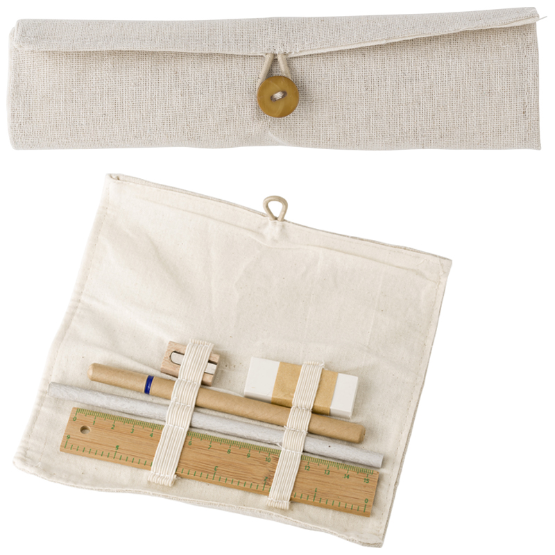 Katoenen oprolbare hoes met schrijf set, inclusief: bamboe liniaal, houten puntenslijper, gum, potlood en papieren en ABS balpen, blauwschrijvend.