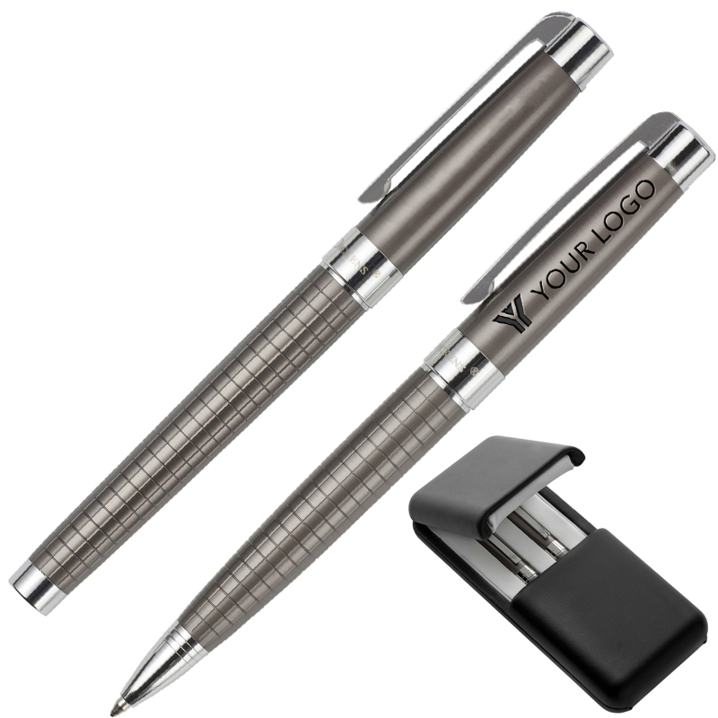 2–Delige Charles Dickens™ schrijfset bestaande uit een metalen balpen met draaimechanisme en rollerbal, zwartschrijvend, in een luxe geschenkverpakking.