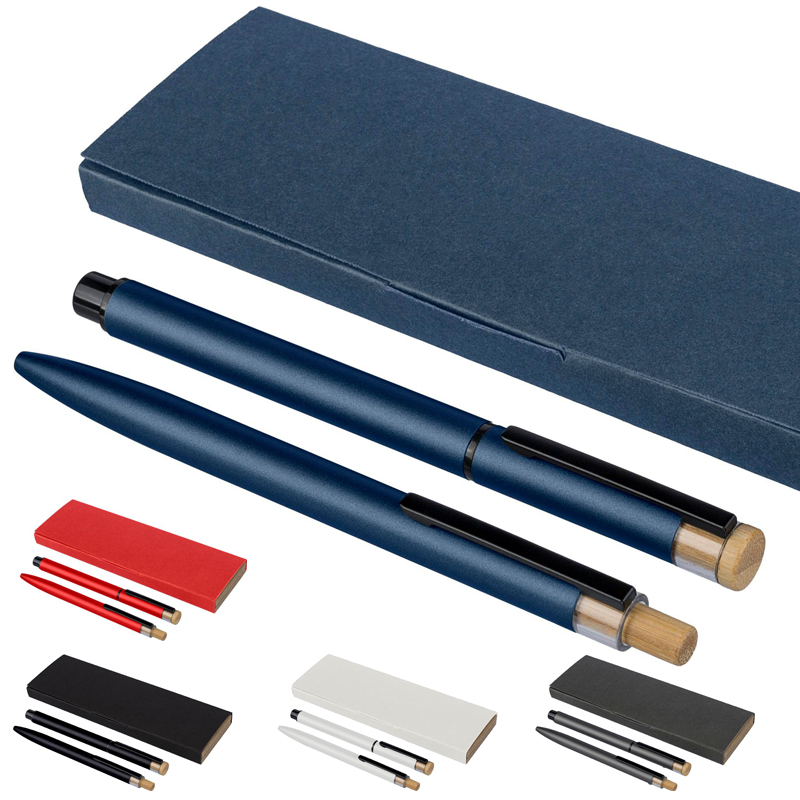 Gerecycleerde aluminium gelakte pennen set bestaande uit een balpen met bamboe drukknop, rPET afwerking en metalen clip, en een rollerpen met bamboe en rPET detail in de dop en bijpassende metalen clip.