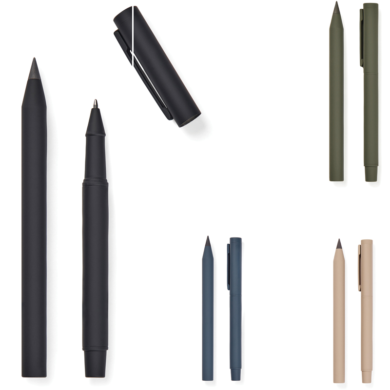 Deze moderne en stijlvolle set bestaat uit twee pennen: een eeuwigschrijvende pen en een klassieke balpen met dop en clip.