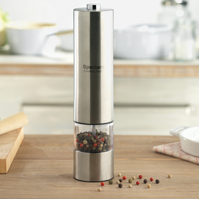 Roestvrijstalen elektrische peper– of zoutmolen.