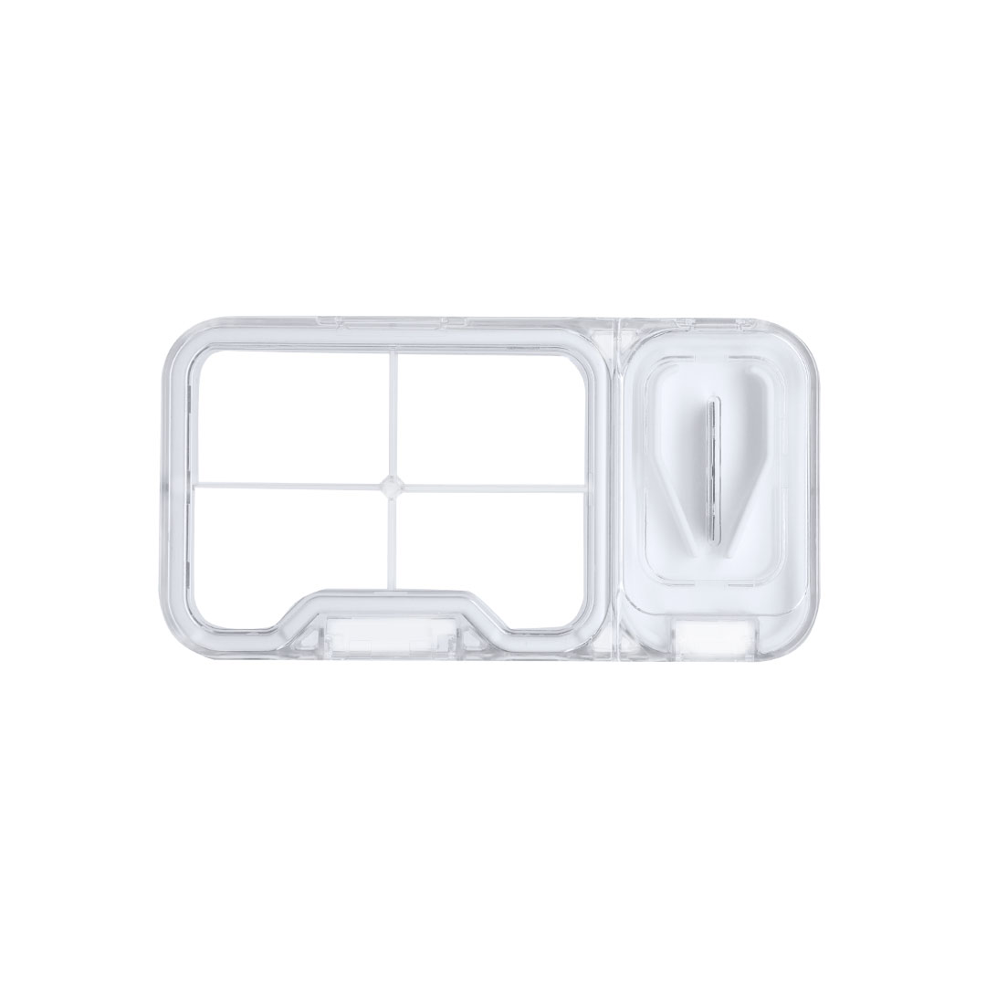 Pillendoos met 4 interne compartimenten, voorzien van een veiligheidssluiting met siliconen randen en een mes om pillen te snijden.