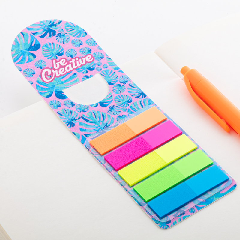 Inclusief 100 paginamarkeringen van plastic folie in 5 verschillende kleuren (44×12 mm).