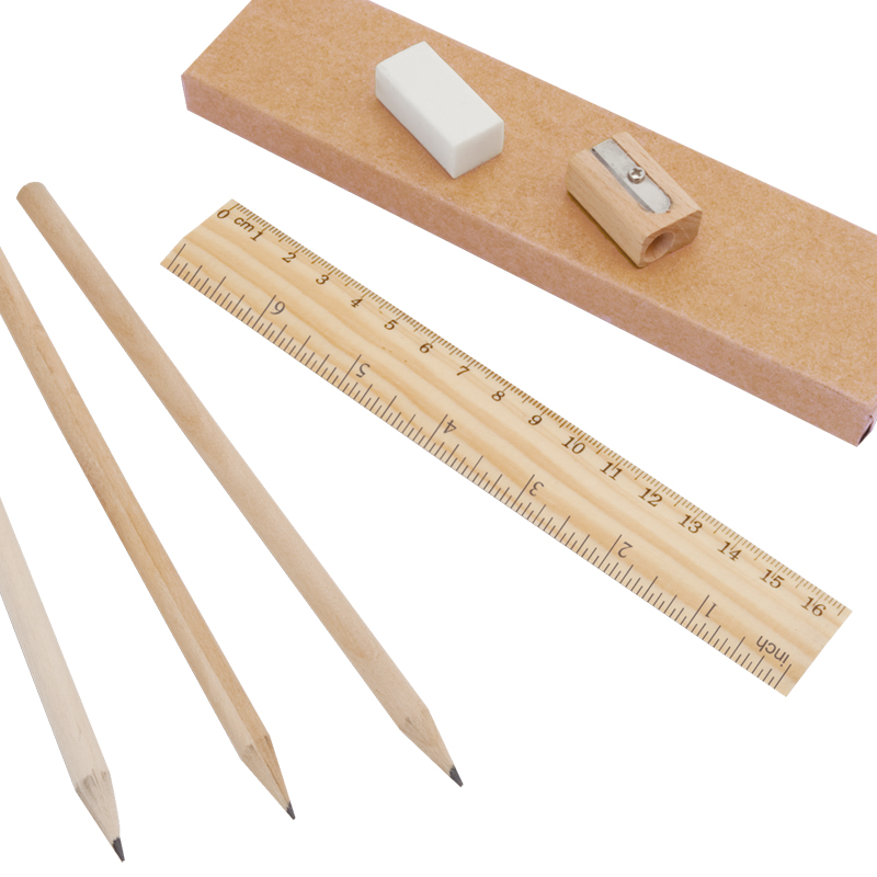 Drie grafieten potloden met liniaal, puntenslijper en gum.
