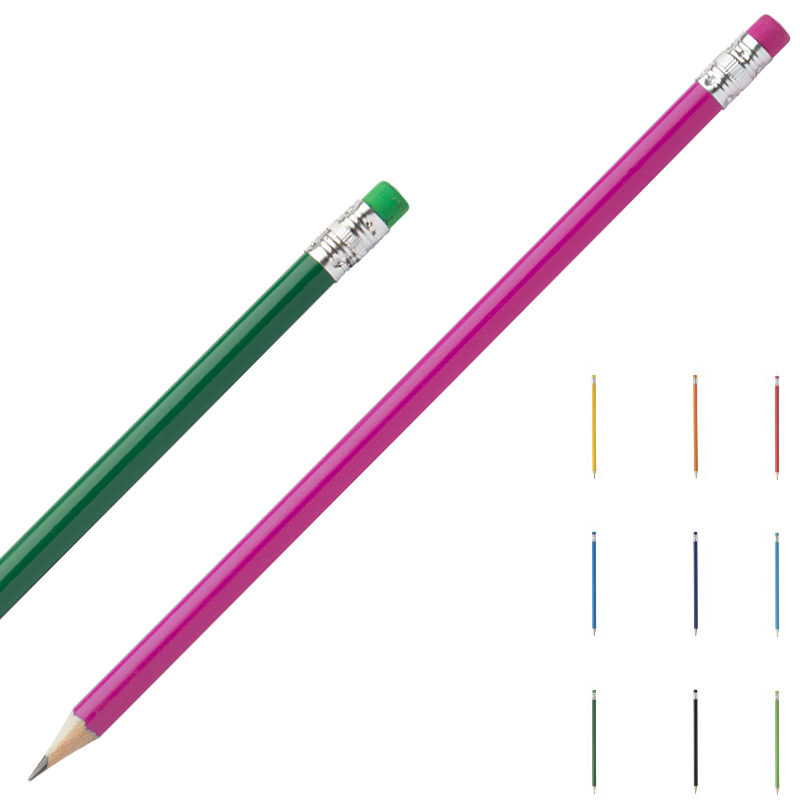 Houten potlood met rond lichaam in diverse heldere kleuren en gum in bijpassende kleur.