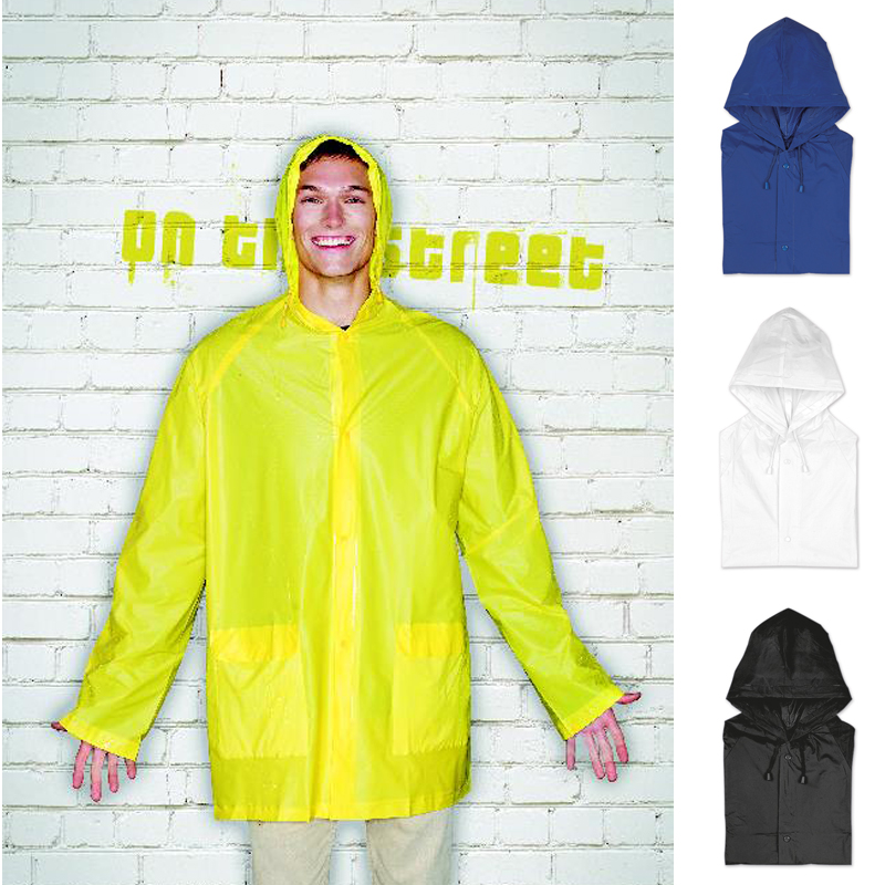 Regenjas PVC met capuchon en drukknoopsluiting.