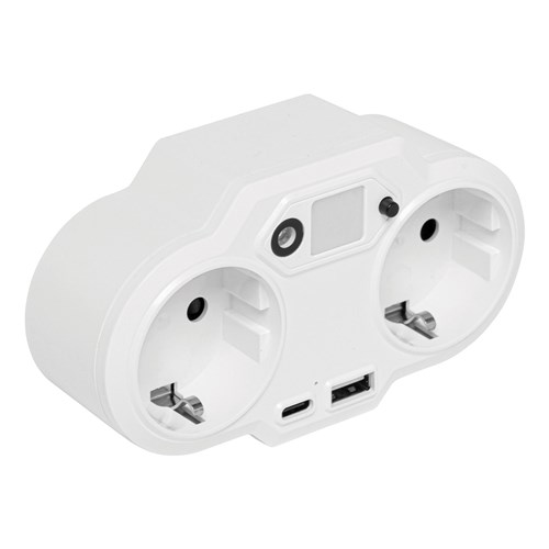 USB-adapterstekker voeding met nachtlampje ENDLESS POWER NIGHT: 2 geaarde Schuko-stopcontacten met kinderbeveiliging, 1 USB A-poort, 1 USB type C-poort, totaal USB-uitgangsvermogen: max 3,4 A, uitgang vermogen Schuko stekker max 3,250 W.