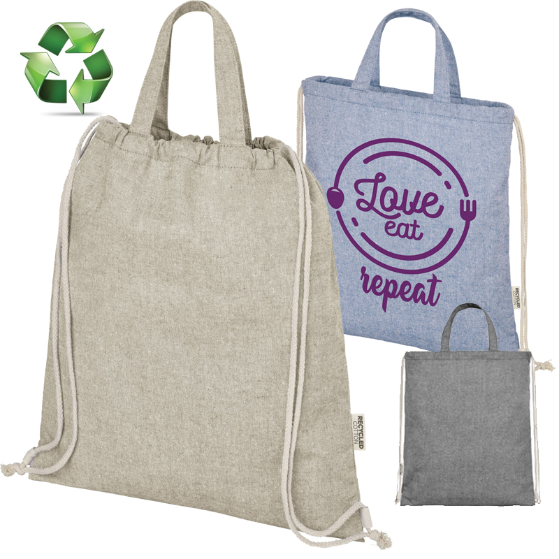 Rugzak met trekkoordsluiting gemaakt van een mix van gerecycled katoen en polyester van 150 g/m2.