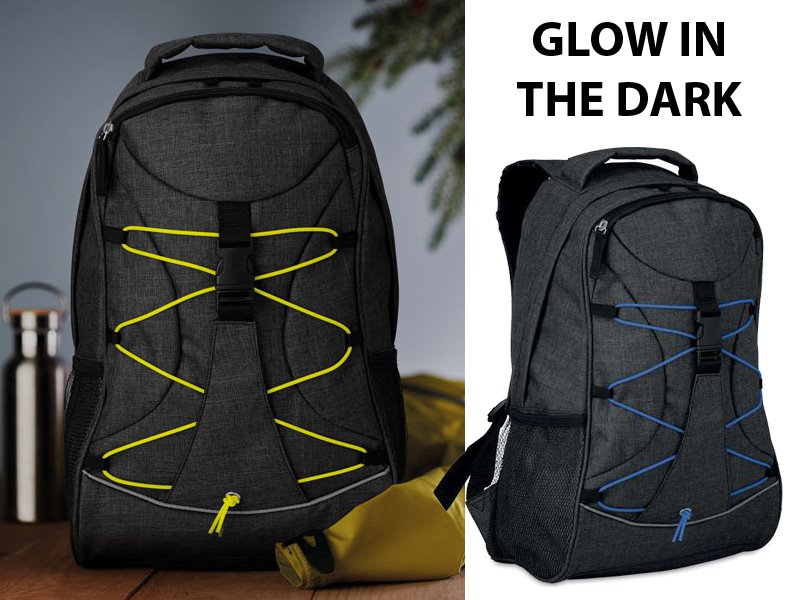 2-tone polyester rugtas van 600D met gekleurde glow in the dark koord aan de voorkant.