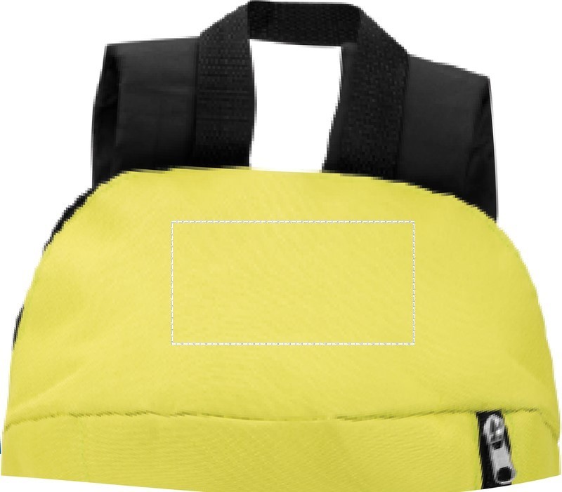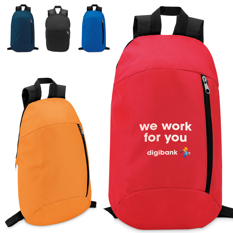 Rugzak van 600d polyester met voorvak met rits, verstelbare draagbanden en draaglus aan de bovenzijde.