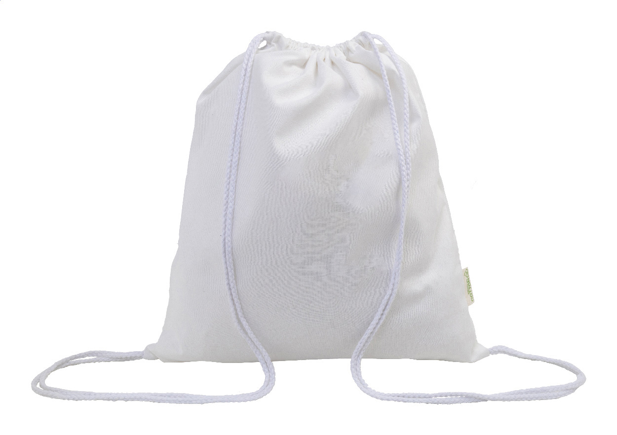 Trekkoordzak van 70% gerecycled katoen en 30% RPET polyester, 140 g/m2. Met onderscheidend gerecycled katoenen label.