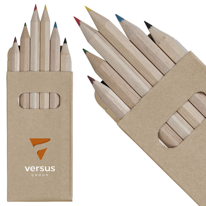 6 houten, ongelakte kleurpotloden in een gerecycled kraft doosje.