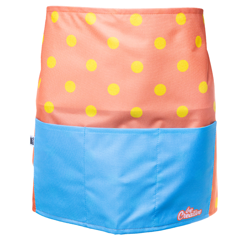 Custom made 600D RPET polyester kelnerschort met drievoudige voorzak en all over sublimatie bedrukking en onderscheidend RPET label.