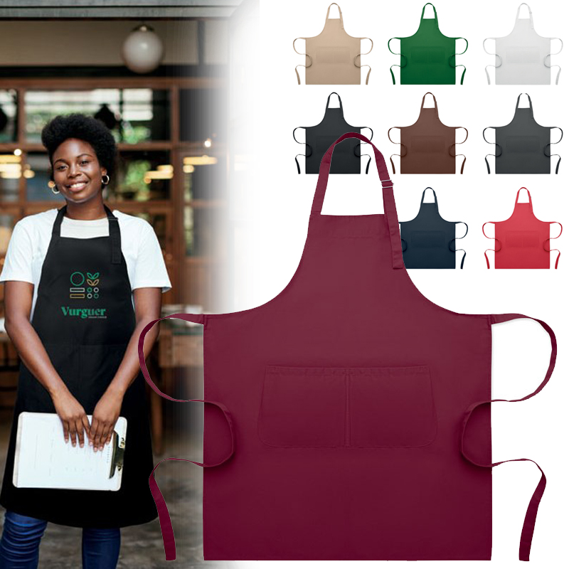 Lang, verstelbaar keukenschort van 240g/m² polykatoen (35% katoen, 65% polyester) met twee voorzakken en verstelbare riem met metalen gesp.